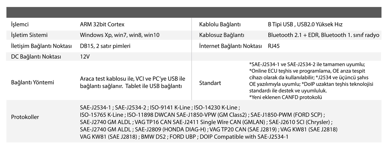 Renault, Subaru, BMW, VAG, Mercedes, Opel (GM), JLR, Volvo, Ford, Mazda, Toyota ve Honda gibi OEM yazılımlar ile çalışabilen bir interfacedir.